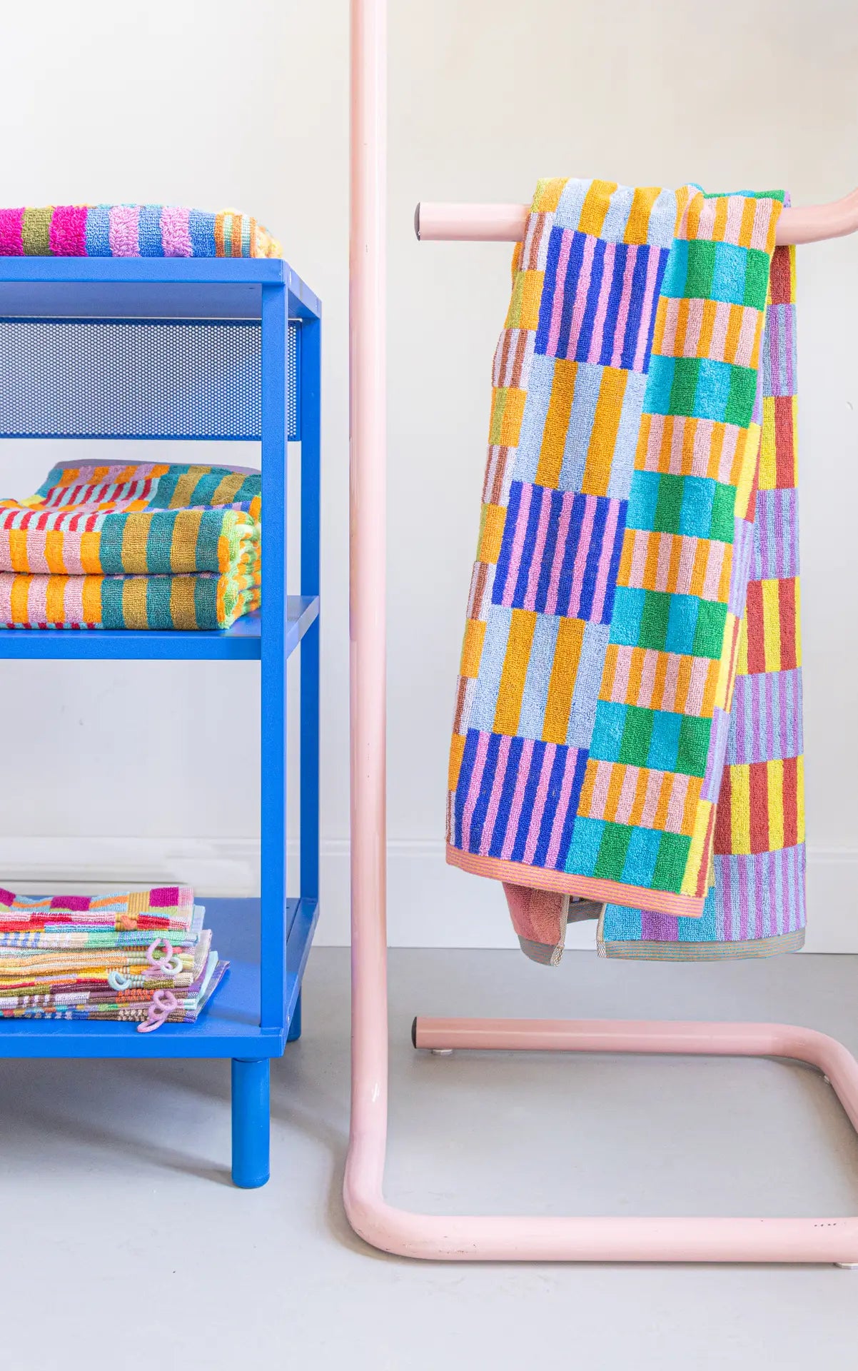 "In Tulip Quilt, my love for colour, craft, and heritage became one. As a hobby quilter, my eye fell on the beautiful bedspread of tulip fields that covers some parts of the Netherlands in spring. I used this inspiration to create a bathroom textile collection that has space for a large number of coloured remainders."